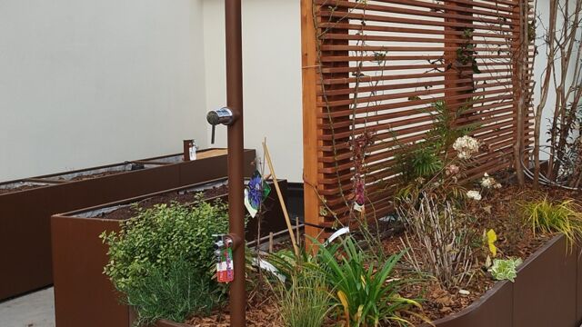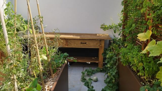 È prevista una struttura frangivista in legno che nasconde lo spazio per il rimessaggio degli attrezzi, un piccolo orto e un angolo gardening per il fai da te e gli interventi su piante e vasi.