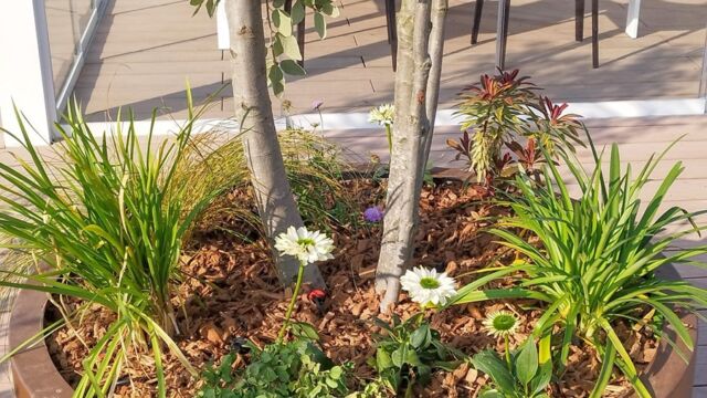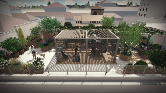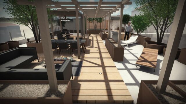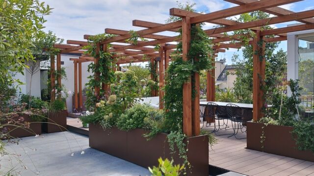 Nel nostro progetto, a definire gli spazi è una pergola bioclimatica che funge da studio e che può essere uno spazio di coworking, oltre a ospitare riunioni. La pergola in alluminio è collegata alle fioriere su misura per creare un movimento armonico.