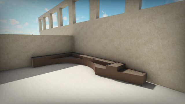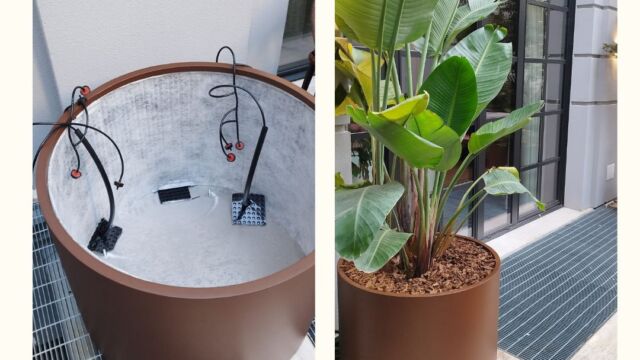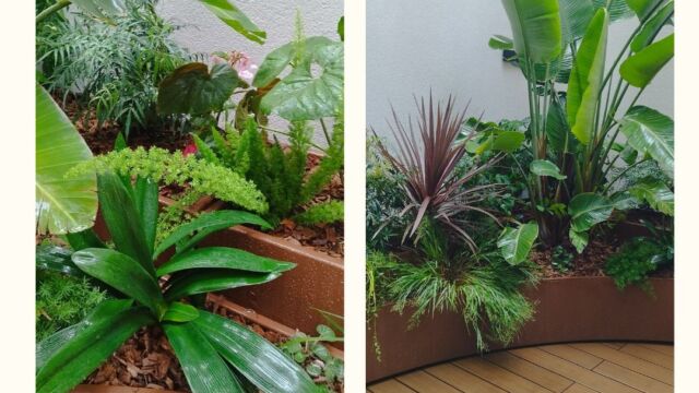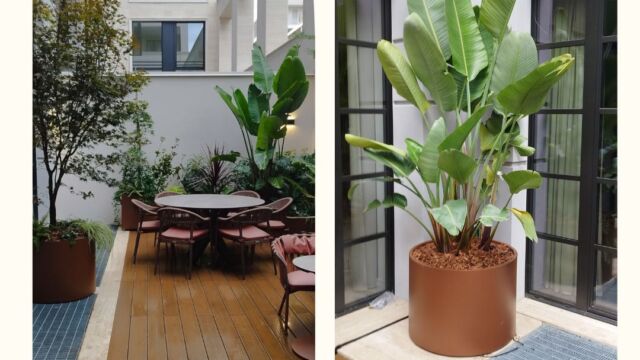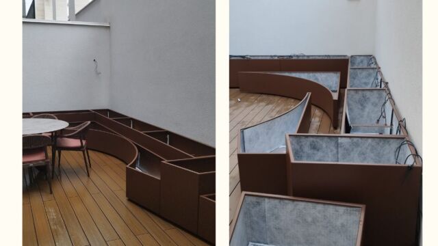 A questo scopo abbiamo realizzato su misura fioriere calandrate, cioè dalle linee curve, in alluminio di 3 mm di spessore verniciato a polvere. In questo modo abbiamo creato un ambiente avvolgente e lo abbiamo animato con piante tropicali ma in grado di resistere alle temperature milanesi.