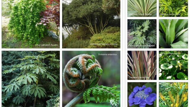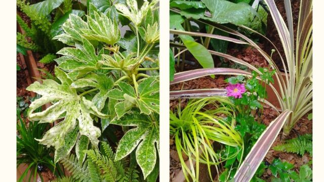 Abbiamo scelto in particolare il Tetrapanax, un piccolo albero tropicale originario di Taiwan con grandi foglie palmate, la Strelizia alba, originaria del Sudafrica, e una grande Dicksonia antarctica, una felce arborea originaria dell’Australia ma in grado di resistere all’inverno. Inoltre non mancano piante da ambiente umido come Fatsia japonica, Saxifraga o felci.