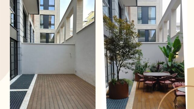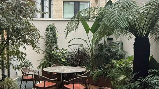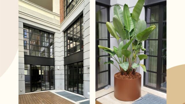 Nel cuore di un prestigioso palazzo recentemente ristrutturato, finestre a tutta altezza lasciano entrare nelle stanze il verde lussureggiante che ha dato vita al cortile.