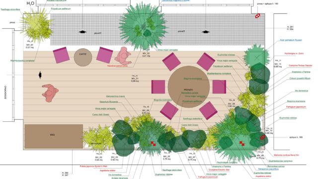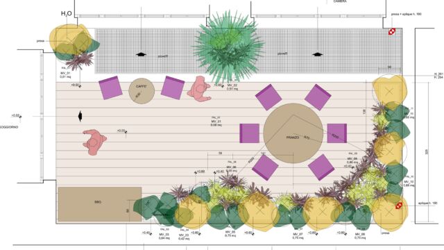 Il desiderio della committenza era quello di realizzare un cortile mediterraneo, ma ciò non è stato possibile perché, per quanto luminoso, lo spazio è esposto a nord e circondato da muri molto alti, che consentono l’accesso del sole diretto soltanto per pochissime ore.