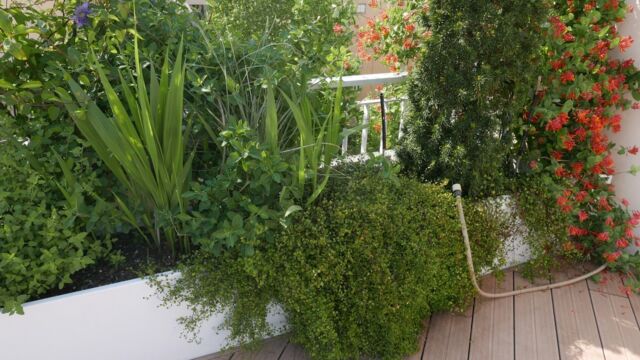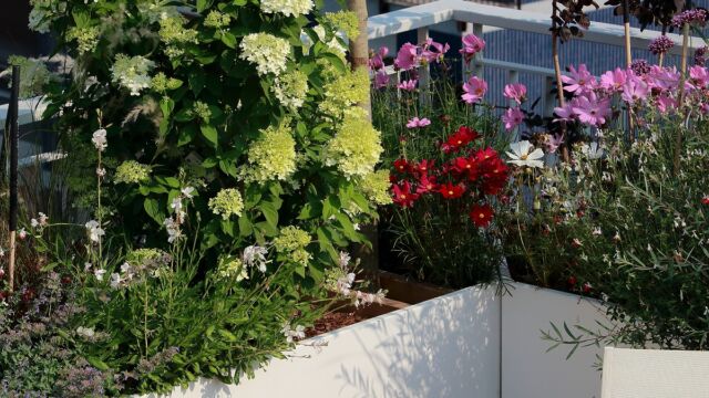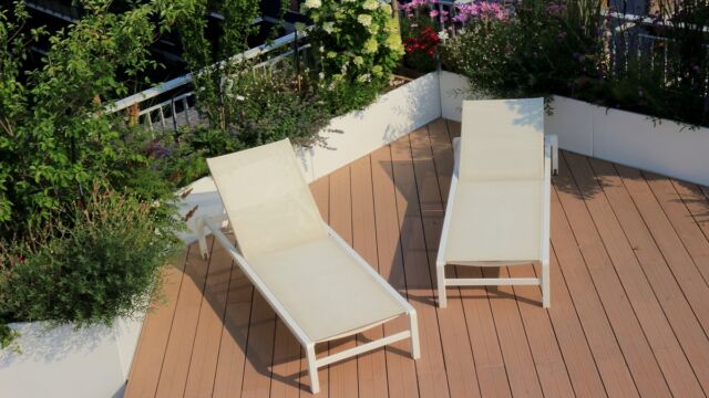 Tredici grandi fioriere in metallo di dimensioni differenti, e coibentate internamente per non far scaldare le radici, vengono disegnate in modo che si incastrino alla perfezione con pergola e deck. Il piano di piantagione viene pensato nel suo complesso come un insieme di volumi che risulti interessante ed equilibrato dalla primavera fino all’autunno.