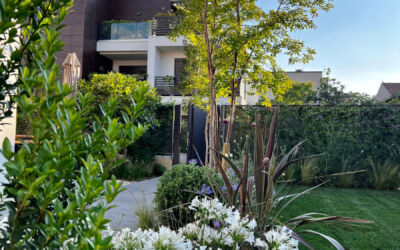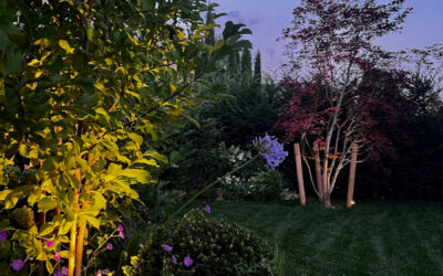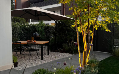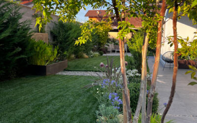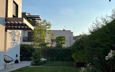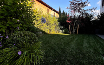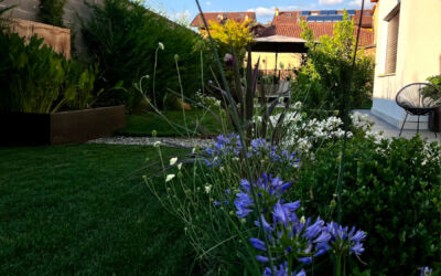 Il giardino nella sua interezza è stato quindi ripensato: la siepe è stata alleggerita con bordure ricche di fioriture come agapanthus, allium e aquilegia; l’impianto di irrigazione, gravemente carente, è stato rifatto. Per dare struttura e movimento sono stati piantumati alcuni alberi selezionati con cura: un ibrido di lagerstroemia americana, due aceri giapponesi, una magnolia da fiore, un amelanchier e un osmanthus ad alberetto.
