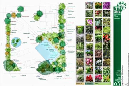 Anche la scelta delle piante segue questa linea, attraverso l’adozione di diverse piante amiche dell’acqua; equisetum, ruellie, iris, salcerelle, ibischi, clolocasie che hanno lo scopo di amplificare la sensazione di trovarsi in un water garden dalla vegetazione lussureggiante. Non manca qualche pianta da bacca – rose, meli e caprifogli in primis – che invitano alla sosta passeri e capinere in cerca di spuntini.