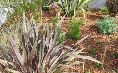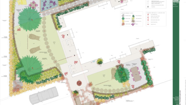 Poco lontano sorgerĂ un living protetto da un rigoglioso pergolato. Quest’area e un camminamento portano alla seconda stanza, cioè una zona piĂą vasta ed esposta a nord-est. Qui la vegetazione è di stampo mediterraneo perchĂ© il giardino è molto assolato. Abbiamo dunque scelto piante come phormium, lagerstroemia, agapanthus, euphorbia e verbena.