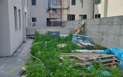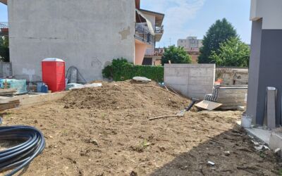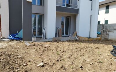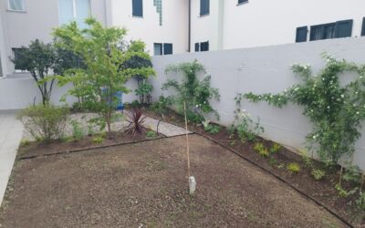 Uno spazio da inventare da zero. Ci troviamo nel giardino di una palazzina di nuova costruzione. L’area a disposizione è piuttosto vasta, ma non ben organizzata e decisamente anonima. La richiesta della committenza è quella di armonizzare gli spazi tra la zona orientata a ovest, a cui si accede direttamente dal salotto, e il giardino propriamente detto orientato a nord-est. Inoltre il desiderio è quello di creare un ambiente adatto a una giovane famiglia con bambini.