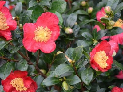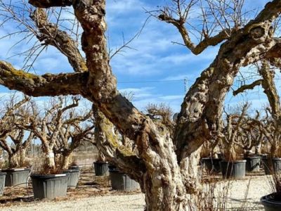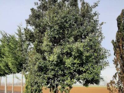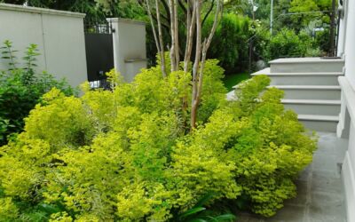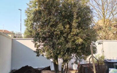 Le alberature principali vengono selezionate con estrema cura, di preferenza piante di dieci o venti anni di età con struttura multitronco per trasmettere maggiore naturalezza. In particolare gli esemplari scelti in vivaio sono un imponente Quercus Ilex (leccio) a ceppaia, un Punica granatum (melograno) dalla struttura particolarmente interessante; una Gleditsia triacanthos ‘Sunburst’ dal fogliame giallo intenso e dal fusto contorto. Una vera chicca è la siepe alta di Camellia sasanqua a fiore semplice rosso.