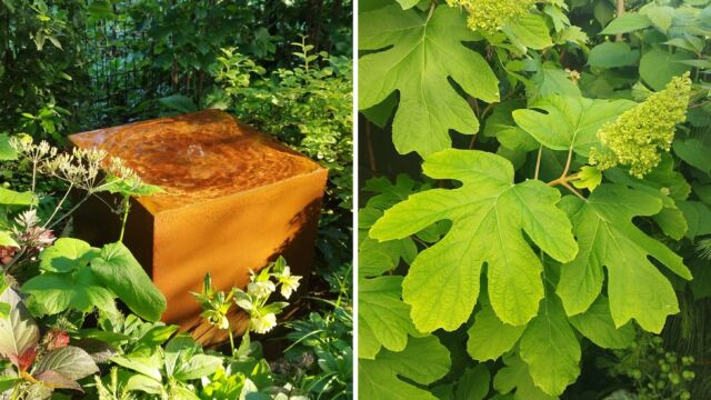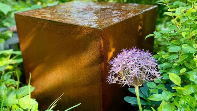 LA FONTANA – Nel mezzo della bordura abbiamo inserito una fontana di design che arricchisce il giardino diventando uno dei suoi punti focali e portando in dote all’ambiente l’elemento acqua. Progettata e realizzata da noi, ha una forma molto pulita, ma allo stesso tempo d’impatto: un parallelepipedo di acciaio corten con una vaschetta alla sommitĂ . Una semplice pompa e un tubo creano il ricircolo dell’acqua che cade dall’alto e scivola lungo le pareti creando un gradevole effetto di movimento.